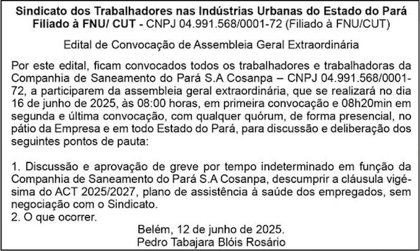 Nesta segunda-feira, 16, trabalhadores e trabalhadoras da Cosanpa decidem sobre a deflagração de greve por tempo indeterminado contra a determinação da diretoria da empresa em mudar a operadora do plano de saúde, hoje a Unimed, sem negociação com o sindicato dos Urbanitários, o que fere a cláusula 20 do acordo coletivo de trabalho (ACT) 2025/2027. O edital de convocação para a assembleia geral extraordinária foi publicado pela entidade sindical no jornal Amazônia da última quinta-feira, 12.