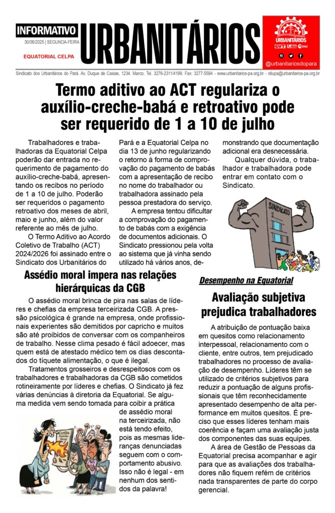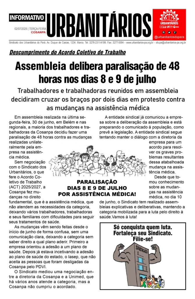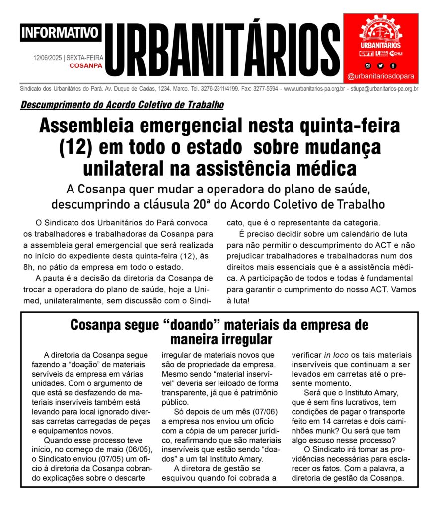 Assembleia nesta segunda-feira (16) decidesobre greve contra mudança na assistência médica A diretoria da Cosanpa quer mudar a operadora do plano de saúde de forma unilateral, descumprindo a cláusula 20ª do Acordo Coletivo de Trabalho Nesta segunda-feira, 16, trabalhadores e trabalhadoras da Cosanpa decidem sobre a deflagração de greve por tempo indeterminado contra a determinação da diretoria da empresa em mudar a operadora do plano de saúde, hoje a Unimed, sem negociação com o Sindicato dos Urbanitários, o que fere a cláusula 20ª do Acordo Coletivo de Trabalho (ACT) 2025/2027.O edital de convocação para a assembleia geral extraordinária foi publicado pela entidade sindical no jornal Amazônia da última quinta-feira, 12.A assembleia será realizada em todo o estado, às 8h, no pátio da empresa. A participação dos trabalhadores e trabalhadoras é de fundamental importância para demonstrar a insatisfação da categoria com a mudança que afeta também as nossas famílias, num dos direitos humanos mais essenciais que é a saúde.O Sindicato tomou conhecimento sobre a decisão da diretoria em mudar a operadora do plano de saúde na última terça-feira, 10, e logo iniciou a mobilização da categoria com a realização de assembleias emergenciais, além de tentar o diálogo com a diretoria da empresa. Também estivemos na Unimed por duas vezes para encontrar alternativa que pudesse levar a um entendimento com a Cosanpa para manter o plano de saúde, pois a operadora que a empresa quer impor não tem rede credenciada em todo o estado.Como ainda não houve uma definição nessa negociação, é preciso uma resposta rápida e contundente da categoria contra essa mudança que prejudica trabalhadores, trabalhadoras e seus familiares. Não podemos aceitar o descumprimento de um direito conquistado com muita luta e mobilização. Vamos à luta!