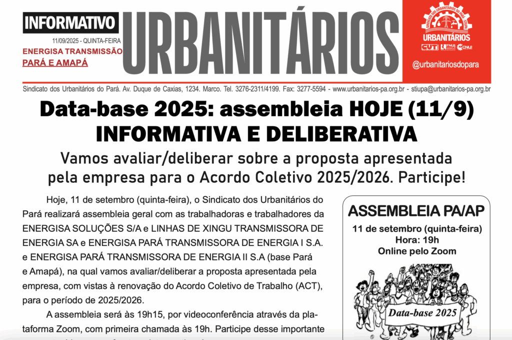 INFORMATIVA E DELIBERATIVAVamos avaliar/deliberar sobre a proposta apresentada pela empresa para o Acordo Coletivo 2025/2026. Participe! 🗓 Nesta quinta-feira, 11 de setembro📍 19h15 (primeira chamada às 19h)📡 Por videoconferência – Plataforma Zoom O Sindicato dos Urbanitários do Pará realizará assembleia geral com as trabalhadoras e trabalhadores da ENERGISA SOLUÇÕES S/A, LINHAS DE XINGU TRANSMISSORA DE ENERGIA SA, ENERGISA PARÁ TRANSMISSORA DE ENERGIA I S.A. e ENERGISA PARÁ TRANSMISSORA DE ENERGIA II S.A (base Pará e Amapá), na qual vamos avaliar/deliberar a proposta apresentada pela empresa, com vistas à renovação do Acordo Coletivo de Trabalho (ACT) 2025/2026. ✊ Vamos em frente, a luta continua! 🔎 O que é a Data-base?A data-base é o período em que o Sindicato (representante dos trabalhadores/as) e a direção da empresa se reúnem para negociar a renovação do acordo coletivo de trabalho (ACT), sempre buscando avanços que beneficiem os trabalhadores/as. 📌 A data-base da Energisa ocorre em 1 de junho. Em maio, o Sindicato iniciou o processo para renovação do ACT. Só agora obtivemos uma proposta que pode ser submetida à avaliação dos trabalhadores/as. 👉 Por isso, é tão importante a sua participação na assembleia de hoje!