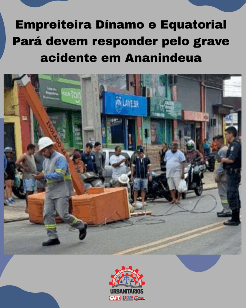 O Sindicato dos Urbanitários do Pará repudia a irresponsabilidade da empreiteira Dínamo e da concessionária de energia Equatorial Celpa, contratante da Dínamo, em relação à vida dos trabalhadores/as do setor elétrico no Pará. O acidente ocorrido ontem, 27/11/25, em Ananindeua, ferindo gravemente dois companheiros da Dínamo, que trabalha a serviço da Equatorial, expõe a cruel e desumana realidade desses trabalhadores terceirizados. O acidente aconteceu porque quebrou, rompeu o suporte do cesto aéreo do caminhão munk, jogando ao chão dois trabalhadores que faziam manutenção na rede de alta tensão na avenida Hélio Gueiros, em Ananindeua. Não precisa ser especialista para constatar que o equipamento quebrado e que causou o grave acidente resulta de falta de manutenção no caminhão, desrespeito à vida dos trabalhadores. O Sindicato dos Urbanitários do Pará está acompanhando esse grave acidente ocorrido nesta quinta-feira, 27, com trabalhadores dessa empreiteira da Equatorial, que contrata, paga mas não fiscaliza e nem exige o cumprimento de normas de segurança e de direitos dos trabalhadores, mesmo sendo responsável e detentora da concessão do serviço de distribuição de energia elétrica no Pará. Após denúncia do Sindicato dos Urbanitários do Pará, Ministério Público do Trabalho (MPT) e Superintendência Regional do Trabalho e Emprego (SRTE) abriram procedimentos para apurar este trágico acidente envolvendo dois pais de família.