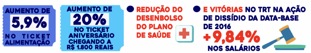 Avanços importantes em 2023! Conquistamos 6% de reajuste nos salários e pisos, além de 19,2% no auxílio-alimentação — que subiu de R$ 1.188,25 para R$ 1.416,40 — sem necessidade de greve. Também garantimos um nível no PCS com 3,2% de reajuste para toda a categoria.