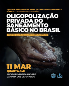 Na Câmara dos Deputados, nesta quarta-feira (11/3), às 14h, acontece o seminário “Oligopolização Privada do Saneamento Básico no Brasil, Riscos e Ameaças à Universalização”.