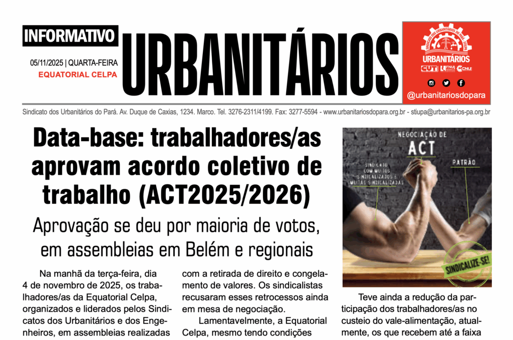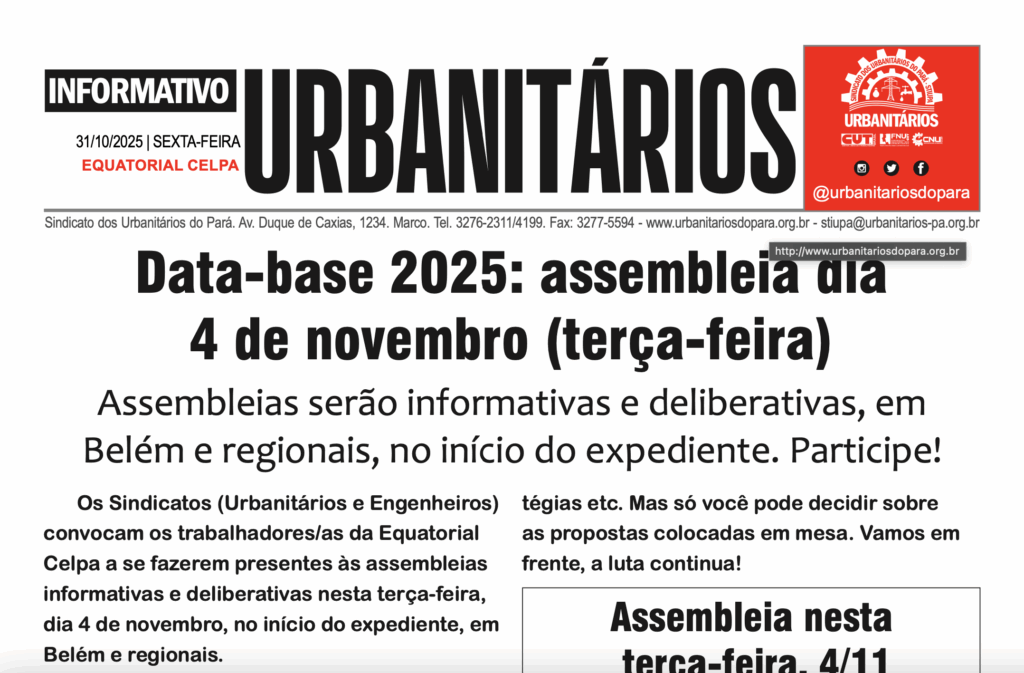 Nesta terça-feira, 30 de dezembro de 2025, às 18h30, em primeira convocação, e às 19h, em segunda e última convocação, teremos a assembleia de prestação de contas do Sindicato dos Urbanitários do Pará referente ao ano de 2024.A assembleia será híbrida, presencial (sede do Sindicato, em Belém) e online por videoconferência, através da plataforma Zoom.O Edital de Convocação da assembleia de prestação de contas, conforme prevê o Estatuto da Social da entidade sindical, foi publicado no Amazônia Jornal, edição de 27/12/2025, veja ao lado. O Sindicato fica na avenida Duque de Caxias, 1234, no bairro do Marco.Participe, conheça os balanços financeiros do seu Sindicato. Saiba sobre a arrecadação e gastos da sua entidade sindical! A luta continua!LINK:https://us06web.zoom.us/j/88374181473ID da reunião: 883 7418 1473Celular: instale o aplicativo previamente nas lojas de aplicativos dos sistemas IOS ou Android.Computador: basta copiar e colar o link de acesso das salas no navegador do computador, para ser encaminhado para a assembleia.